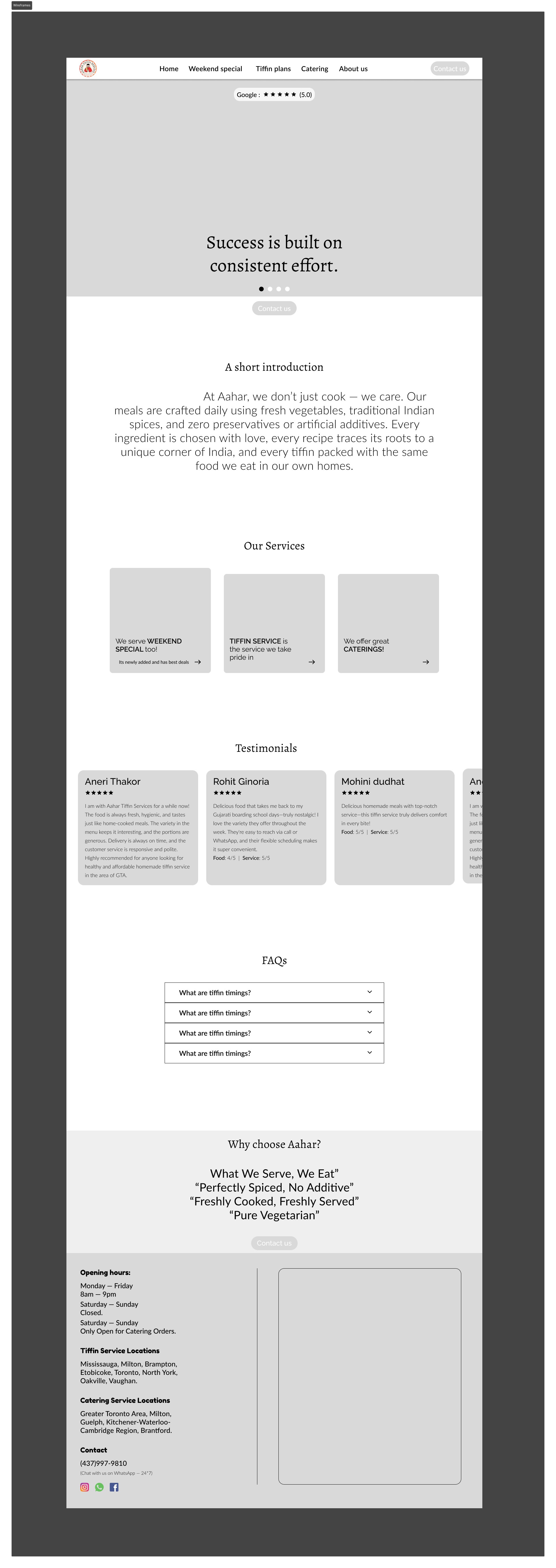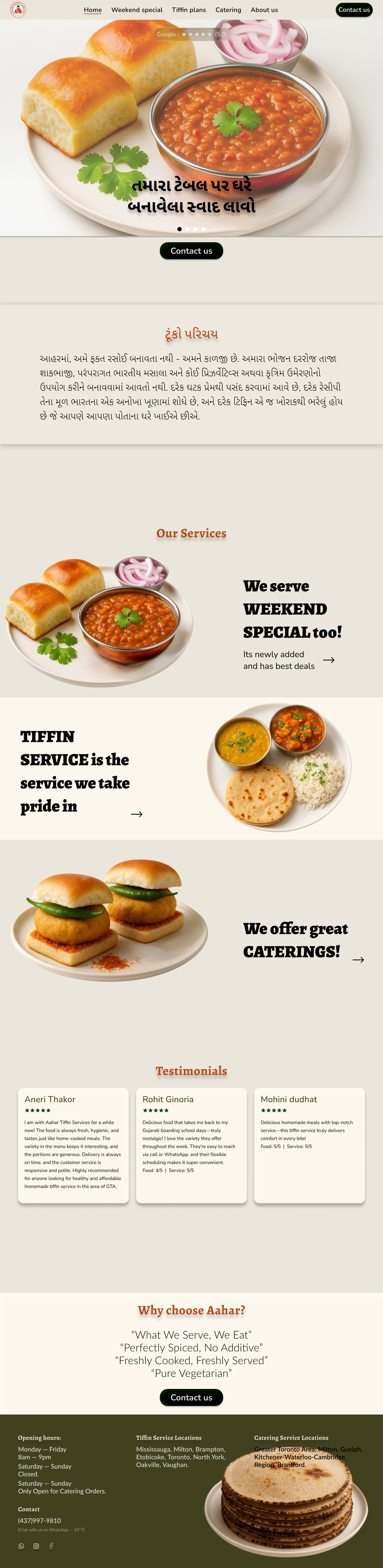 Designed a clean, easy-to-navigate platform highlighting meal options, timings, and delivery details. Created an approachable brand identity that reflects warmth, authenticity, and home-style cooking. Simplified the ordering and subscription process, making it effortless for users to manage their daily meals. Enhanced customer trust through clear communication, FAQs, and visual consistency. Helped position Aahar as a modern tiffin service that bridges the gap between home kitchens and customers’ busy lifestyles.